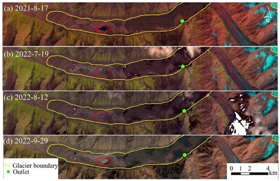 Changes in the main drainage channel and supra-glacier lake of Garmo Glacier. Red circles showed the disappearance of supraglacial lake. (Landsat OLI images, Band 654 composite).