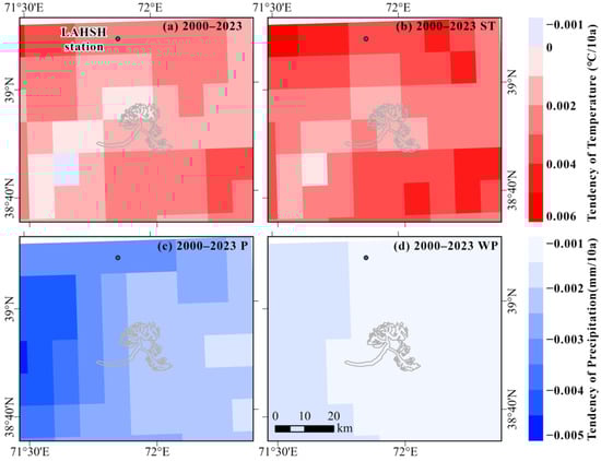 The tendencies of temperature and precipitation around the Garmo Glacier from 2000 to 2023: (a) tendency of the temperature; (b) tendency of the summer temperature (from May to October)l (c) tendency of the precipitation; (d) tendency of the winter precipitation (from November to April).
