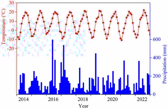 Monthly air temperature and precipitation in the LAHSH station near Garmo Glacier from 2014 to 2022.