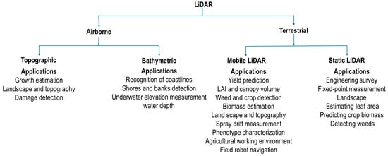 Studies in the literature highlight four LiDAR-based scanning systems: ground LiDAR scanning (GLS), stationary LiDAR scanning (SLS), airborne LiDAR scanning (ALS), and mobile LiDAR scanning (MLS) []. According to the scanning angle, LiDAR is mainly classified into two classes: airborne and terrestrial and LiDAR [,]. Based on typical operations, terrestrial LiDAR systems often perform horizontal scanning with a 360° field of view. Depending on the system, the scanning may be one-dimensional (1D), capturing distances along a single axis, or two-dimensional (2D), where horizontal scanning is combined with vertical angular movements to capture a plane of data. Airborne LiDAR scans the objects/areas downward, with a vertical scanning angle of 180°; it is typically mounted on aircraft or drones, emitting lasers toward the ground, which are reflected and returned to the LiDAR for creating accurate 3D terrain maps that are often integrated with other remote sensing technologies []. Airborne LiDAR is subclassified into bathymetric and topographic LiDAR. Bathymetric LiDAR is used near coastlines, shores, and banks to measure underwater elevation and water depth simultaneously []. Topographic LiDAR, typically deployed on airborne systems, is used for large-scale applications such as forestry, landscape assessment, urban planning, and crop monitoring [,,,,,,,,]. Terrestrial LiDAR, on the other hand, includes mobile and static types. Mobile terrestrial LiDAR, which operates from ground vehicles or handheld platforms, shares some applications with topographic LiDAR, such as landscape and infrastructure analysis, but is primarily suited for detailed mapping of road signs, light poles, and other urban features [,]. Static terrestrial LiDAR is primarily used for engineering surveys and fixed-point measurements, and both types of terrestrial LiDAR are applied in agriculture for assessing landscapes, estimating leaf area, predicting crop biomass, and detecting weeds [,,,,,]. Figure 1 shows a detailed classification of LiDAR sensors, along with their various applications in agriculture.
