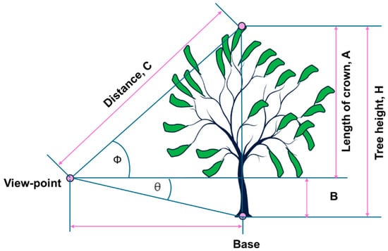 where H is the estimated total height of the tree (m), D is the distance from the viewpoint to base (m), B is the height of the crown from the base (m), Φ is the angle to the top of the tree (ᵒ), is the angle to the bottom of the tree (ᵒ), and A is the length of the crown (m).