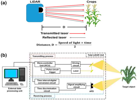 LiDAR technology offers a solution by providing real-time obstacle detection in these challenging environments. However, obstacles in agricultural fields, such as moving tools and pedestrians, complicate detection and affect decision-making, increasing the risk of uneven operations and collisions [,]. While this 3D sensor has been adopted to address these challenges, current methods often lack precision and affect real-time performance [,,,,]. Advancing this high-precision, sensor-based detection is crucial for improving intelligent agricultural machinery. This sensor, which consists of a laser transmitter, a laser diode (LD), an avalanche photodiode (APD), a time-to-digital converter (TDC), and signal processing units, can estimate the exact distance of obstacles in real-time, as shown in Figure 5a,b.