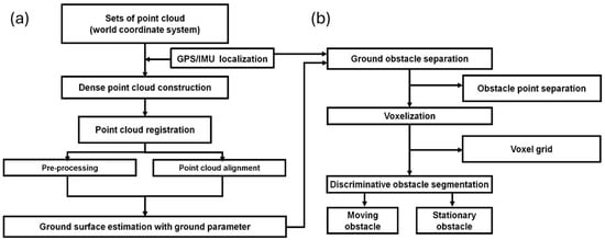 System architecture: (a) ground surface elimination; (b) detection of static and dynamic obstacles (modified from []).