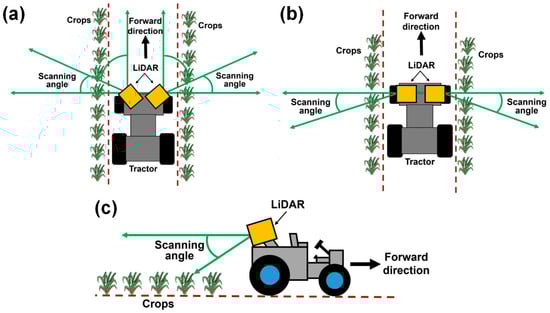 Schematic diagram of application of LiDAR using agricultural machinery: (a) front scanning, (b) side scanning, and (c) back scanning.