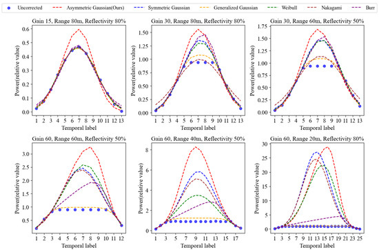 Several typical cases of waveform raw data and their recovery results are visualized in Figure 3, featuring diverse APD gains and object distances. It can be observed that although many point series without the top-clipping phenomenon appear symmetric, top-clipped waveforms show heavy asymmetry and degenerate the process of edge matching using symmetric models (namely, symmetric and generalized Gaussian models). The generalized Gaussian model also shows the tendency of flattening its top, which is detrimental in waveform recovery tasks due to the lack of compensation in the optical power of the clipped region. While some comparative models involve asymmetry, they are not necessarily suitable in all cases. It is worth mentioning that the Weibull, Nakagami, and Burr models all involve parameters as varying exponents, which leads to large deviation in the Jacobian matrices during optimizing processes. When the falling edge is steeper than the rising edge, where a large exponential index is required yet difficult to optimize, their recovered waveforms tend to overfit or underfit the effective sample points. The proposed asymmetric Gaussian model, in contrast, tackles both problems of matching asymmetric edges and constructing the clipped peak, manifesting its promising prospects in intensity correction.