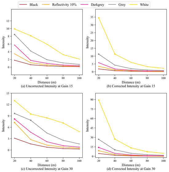 where and are the reflectivity of the target and the reference object, while and are the corrected intensities for the target and reference object at the same distance.