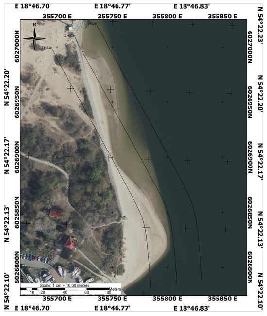 The waterbody in which the measurements were carried out was the Vistula River mouth in Gdańsk (Pomorskie Voivodeship, Poland), and more precisely, one of the estuary arms of the Vistula River, commonly referred to as the Vistula Śmiała [35]. The Vistula Śmiała River, with a total length of 2.5 km [36], which flows into Gdańsk Bay, separates Port Island (in the west) from Sobieszewska Island (in the east). The characteristic features of the west bank include the structures of the Wisła Shipyard and the National Sailing Centre (NSC) of the Gdańsk University of Physical Education and Sport (GUPES). The site also includes the Green Islands, which are an ecological site [37]. The beach surface, along which the surveys were conducted, is sandy. The Vistula Śmiała River mouth in Gdańsk is located in Universal Transverse Mercator zone 34 North (UTM 34 N) (Figure 1) [38].