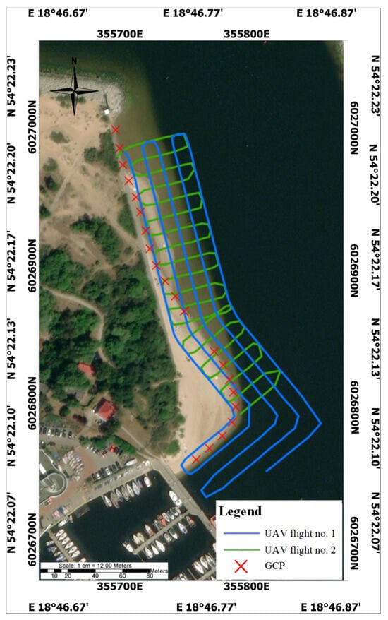 The measurements conducted on 7 November 2023 were aimed at acquiring photos through the use of the Aurelia X8 Standard LE UAV and the Sony A6500 camera with the Sony E 35 mm f/1.8 OSS lens. The aerial images and the products obtained from them, e.g., files in the LAS format, allowed the shallow-water bathymetry to be densified at further stages, thereby increasing the measurement precision. The mission was completed in windless weather. The water level from a specific hour of the flight pass performance was taken into account in the further development of the bathymetry. The flight pass was performed autonomously by a drone at a height of 120 m. In addition, a polarising filter was installed on the camera, which enabled a reduction in undesirable reflections on the image [49]. Moreover, the area was covered with 21 Ground Control Points (GCPs), which were determined with high accuracy by the GNSS RTK method in the PL-UTM (zone 34 N) and the PL-EVRF2007-NH height system. GCPs were designed along the coastline as close as possible to the shore at equal distances in accordance with the methodology developed in the publication [50]. The distribution of GCPs and UAV flights in the study area is presented in Figure 4. Both the mean horizontal precision and the mean vertical precision of GCPs amounted to approx. 0.03 m.