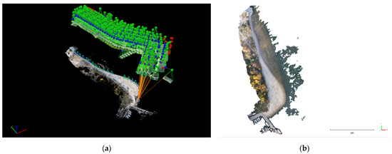 The photos derived from the Sony camera installed on the Aurelia X8 Standard LE UAV and GCPs recorded during the second measurement campaign had to be entered into the Pix4Dmapper 4.7.5 software. This program allows a point cloud to be obtained based on the above input data, as it operates based on the SfM algorithm [52,53], distinguished by its provision of three-dimensional scenes. To this end, a series of temporal RGB images (photos) and georeferencing information (control points) were used. Thanks to using automatic algorithms for estimating the camera’s position, it also provides information on the internal and external camera’s orientation at the time of acquiring each image, which enables the determination of how individual three-dimensional coordinates are projected onto the resulting photos [18,54]. In the Pix4Dmapper 4.7.5 software, it was also necessary to define the output coordinate system, which in this case was the PL-UTM system (zone 34 N), i.e., the same as that in each previously described independent survey. Figure 6 shows the georeferenced images and a point cloud in the LAS format obtained based on the SfM algorithm. The generated point cloud consisted of 16,361,541 points and covered an area of 0.020 km2. A total of 86% of images (343 out of 398) were calibrated. The mean georeference error was 0.115 m and the mean vertical error was 0.104 m.