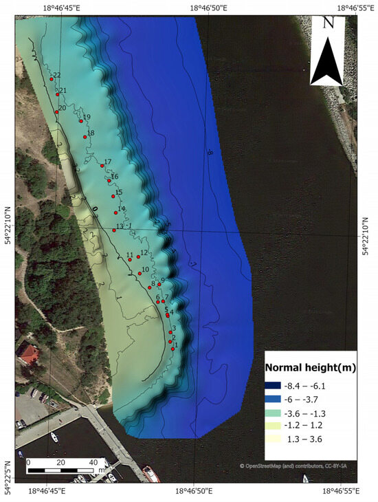 The coastal zone of the Vistula Śmiała River mouth in Gdańsk is a recreational place due to the sandy beach located in this area. The seabed topography is characterised by a quite gentle descent into the water, because the 1 m isobath is located at a distance of no less than 10 m from the shore, while the 2 m isobath is within 15 m of the coast. A sudden drop in the waterbody depth can be observed from the 2 m isobath to the 6 m isobath, because the distance between them is approx. 10 m. At a distance of 50 m from the shore, the waterbody depth amounts to approx. 7 m, while at a distance of 80 m from the coast, the waterbody depth is about 8 m. In this part of the waterbody, there is a water route connecting the Vistula Śmiała River mouth with Gdańsk Bay. The greatest slope of the terrain can be observed in the southern part of the beach. This is most likely due to the proximity of the NSC-GUPES. To generate the contours and calculate the distances between them, we used the Contour tool in the ArcMap software, which creates a class of contour features from a raster surface. The input file was a file generated using the Topo to Raster tool. In ArcMap’s Contour tool, an interval of 1 m was selected, and the program generated contours and calculated the distances between them automatically. The distance ranges from the shoreline to each isobath are presented in Table 4.