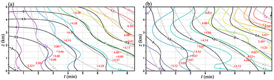 However, at the initial time t0, the third-step estimated xc(z, t0) differs from the extensively estimated xc(z, t0) significantly, as revealed by the values displayed by the color curves versus the black curves along the left boundary of t = t0 in each panel of Figure 1. In particular, as shown in Figure 1a, the difference between the two estimated xc(z, t0) becomes even larger than 1 km above z = 3.5 km, indicating large errors in the third-step estimated xc(z, t0) for z > 3.5 km. These large errors are caused by the absence of data at and near t = t0, especially above z = 3.5 km, where the two data points from the first volume scan are temporally displaced from t0 by more than 4 min and there is no data point from the second volume scan. Nevertheless, as shown in [5], the tornado track and intensity predictions improved by using the time–space shift method for vortex relocation are insensitive to errors in the estimated xc(z, t0), so the third-step estimated xc(z, t0) can still be used to perform the vortex relocation.