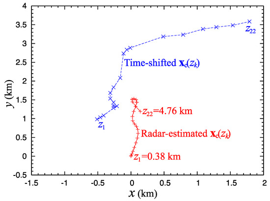 xc(zk, t0) estimated in the third step of the adaptively modified method marked by red line connecting the red + signs at z = zk with k increasing from 1 to 22, where zk is the height of the model kth vertical level above the ground. The blue line connecting the blue × signs marks the time-shifted vortex center at (zk, t0), also with k increasing from 1 to 22, from the best ensemble member run.