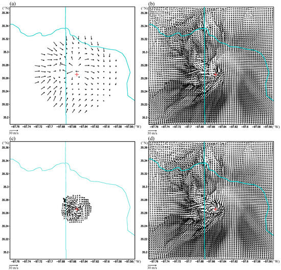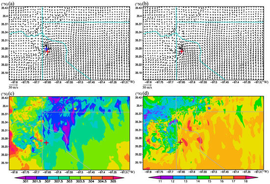 Upon comparing the first two panels of Figure 3, it becomes evident that the strong wind convergence and cyclonic rotation around the vortex center are well preserved by the space-shifted vortex relocation while the time-shifted vortex center (see the blue + sign in Figure 3a) is further shifted to collocate with the estimated vortex center (see the red + sign in Figure 3a or Figure 3b) via the space-shifted vortex relocation. The surface winds in Figure 3b preserve not only the first rear-flank gust-front (which curves and extends southwestward), but also the second rear-flank gust-front (which curves and extends westward behind the first rear-flank gust-front), as well as the extended zone of strong wind shift and convergence north of the vortex core. Additionally, as shown in Figure 3c,d, the time–space shift preserves the temperature and humidity variations across and along these frontal zones in the vicinity of the vortex core. These time–space shifted wind fields, valid at t = t0, serve as the initial background for assimilating retrieved vortex winds in Section 4.