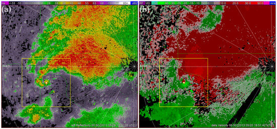 An example is given here to demonstrate how the verification maximum surface wind speed (58.2 m/s) and vorticity (0.38 s−1) at the forecast time of t = 25 min is extracted from the dual-Doppler retrieved vortex wind field produced by applying VF-Var to the KTLX volume scan (consisting of 10 tilts from 0.9° to 12.5°) over the time period from 2013:33 to 2016:09 UTC and the PAR sector scan (consisting of 14 tilts from 0.5° to 23.4°) over the time period from 2013:55 to 2014:48 UTC. Images of reflectivity and dealiased radial velocity, on 0.9° tilt of the above KTLX volume scan, are depicted, respectively, in Figure A1a and Figure A1b where the square area (of 20 × 20 km2) enclosed by the thin yellow boundary line shows the retrieval domain at the height of the observed vortex center (z = 450 m) on 0.9° tilt. Images of reflectivity and dealiased radial velocity on 0.5° tilt of the above PAR sector scan are depicted, respectively, in Figure A1c and Figure A1d where the square area enclosed by the thin yellow boundary line shows the retrieval domain at the height (z = 127 m) of observed vortex center on PAR 0.5° tilt.
