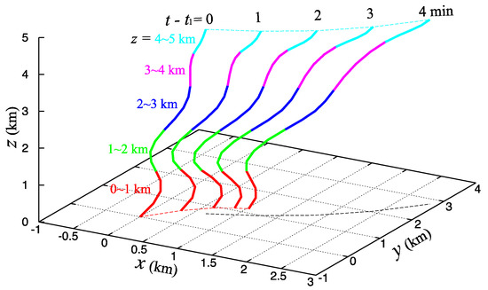 Figure 5 shows a 3D perspective of the estimated vortex center axis viewed in the local Cartesian coordinate system (x, y, z) at one minute intervals from the beginning to the end of the analysis time window, where the origin of (x, y, z) is at xc(0, t1), that is, in the estimated vortex center location at (z, t) = (0, t1), t1 corresponds to 1951:42 UTC which is 1 min 42 s after t0 (1950:00 UTC), and the vortex center axis is a continuous vector function of z defined by xc(z, t) at given t. As shown, during the 4 min of the analysis time window, the vortex center axis becomes more slanted and less upright, especially above z = 2 km, as it moves northeastward. This vortex center axis is taken to be the slantwise vertical coordinate axis for z’ in the vortex-following coordinate system (x’, y’, z’, t’) defined, as in Equation (2.1a) of [6], by