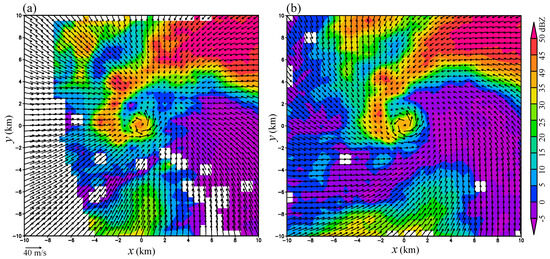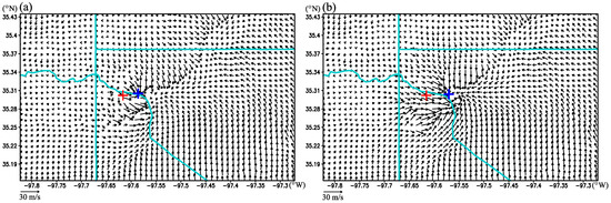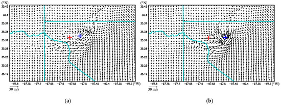 The third-step estimated xc(z, t0) mentioned above is shown in Figure 2 by the red line connecting the red + signs as a function of zk with k increasing from 1 to 22, where zk is the height of the model kth vertical level above the ground. The time-shifted vortex center valid at t = t0 (1950 UTC) from the best ensemble member run is shown in Figure 2 by the blue line connecting the blue × signs as a function of zk also with k increasing from 1 to 22. As explained in [5], a time–space shift is applied to each model prognostic variable from the best ensemble member run on the same tornado-resolving (50 m) grid as that used for the ensemble predictions initialized at 1930 UTC in [11]. The time-shifted model fields valid at t = t0 from the best ensemble member run correspond to those detailed in Section 4 of [5]. As an example, the wind field produced by the time-shifted vortex relocation at t = t0 from the best ensemble member run is shown at the first model level (z = 10 m above the ground) in Figure 3a, while the wind field produced by the space-shifted vortex relocation (after the time-shifted vortex relocation) is shown at the first model level in Figure 3b.