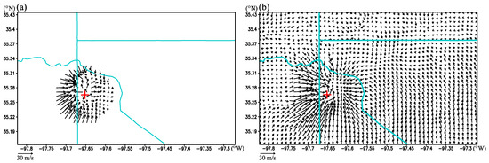 VF-Var is applied to the earliest single-Doppler velocity observations from KTLX within the analysis domain over the analysis time window. The retrieved axisymmetric part of vortex velocity field is still denoted by (u’, v’, w’), and its horizontal components (u’, v’) are converted to the ground-relative vortex winds in (x, y, z) via (u, v) = (u’ + ∂txc + w∂zxc, v’ + ∂tyc + w∂zyc) according to Equation (2). As examples, these ground-relative vortex winds are illustrated by black arrows atop of reflectivity images at the first (or ninth) model vertical level in Figure 6a (or Figure 6b). As shown in Figure 6a, the retrieved ground-relative vortex winds are strongly rotational in and around the vortex core and strongly convergent outside the vortex core over the retrieval domain at the surface level. As displayed in Figure 6b, the cyclonic rotation intensifies around the vortex core and the convergency becomes slightly weak outside the vortex core over the retrieval domain as the vertical level increases to 1 km above the ground. These ground-relative vortex winds also closely match the hook echo patterns observed in KTLX-scanned reflectivity projected onto the model’s vertical levels, as depicted in Figure 6. The retrieved axisymmetric part of the vortex velocity field is stationary in the vortex-following coordinate system (x’, y’, z’, t’) and is assumed to remain stationary in (x’, y’, z’, t’) over the extended time period for t’ (= t) from t0 to t1. As explained in [6], the retrieved vortex velocity field is spatially continuous as it is constructed from analytical VF-dependent covariance functions. The above converted field of ground-relative vortex wind is thus also spatially continuous and will be properly sampled in the next section to generate two batches of “observations” with different spatial resolutions and coverages.