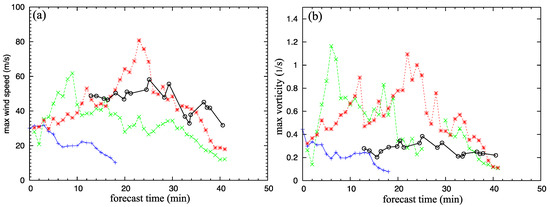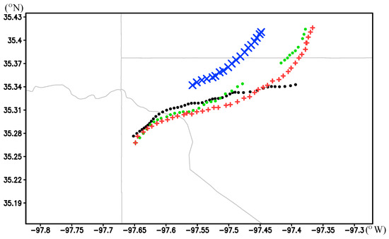 Figure 9 shows that the predicted tornado track in Exp-T1 (green dots in Figure 9) closely matches the observed track (black dots in Figure 9) in comparison to the predicted track from the best ensemble member without vortex relocation (blue × markers in Figure 9). Here, the observed tornado track is determined from the trajectory of the extensively estimated xc(z, t) at the ground level, verified with the tornado damage survey data [18,19]. The extensively estimated xc(z, t) is produced by applying the three-step method [9] to all the 10 volume scans from the KTLX radar and 22 sector scans from PAR over the entire time period (from 1951:42 to 2033:44 UTC) during which the tornado vortex was detected by these two radars. Note that the predicted tornado track in Exp-T1 has a gap between 25 and 30 min of forecast time. This gap arises from the fact that the predicted vertical vorticity at z = 10 m becomes too weak or too noisy to properly define/identify the vortex center during that period.