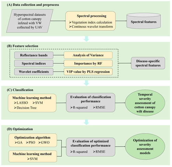 Li, W.; Guo, Y.; Yang, W.; Huang, L.; Zhang, J.; Peng, J.; Lan, Y. Severity Assessment of Cotton Canopy Verticillium Wilt by Machine Learning Based on Feature Selection and Optimization Algorithm Using UAV Hyperspectral Data. Remote Sens. 2024, 16, 4637. https://doi.org/10.3390/rs16244637