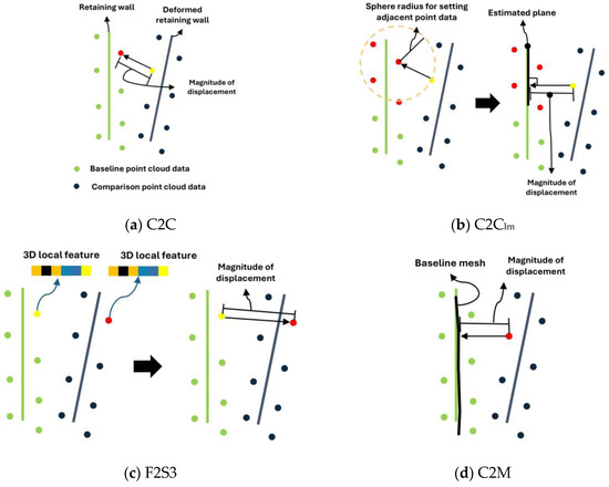 Subsequently, to address the shortcomings of the C2C algorithm, algorithms such as cloud-to-cloud based on local modeling (C2Clm) and feature-to-feature supervoxel-based spatial smoothing (F2S3) were developed. The C2Clm algorithm (Figure 3b) aims to reduce displacement estimation errors caused by sensor errors. It follows the same approach as the C2C method by selecting the closest data point from the baseline point cloud data. The selected data are then used to estimate local models, such as planes, curves, and cylinders, within a certain radius. The displacement is derived by calculating the perpendicular distance between the local model and the data points within the radius [40]. This algorithm has the ability to reduce sensor errors in the baseline point cloud data; however, it has the disadvantage of being sensitive to sensor errors in the direction and comparison point cloud data. The F2S3 algorithm (Figure 3c) uses deep learning to extract 3D local features from the baseline and comparison point cloud data. It then matches the baseline point cloud data with similar 3D local features in the comparison point cloud data and calculates the distance between the two datasets to derive displacement [41]. The algorithm in question employs deep learning algorithms to accurately determine the displacement direction, compared with the C2Clm algorithm. However, it relies on C2C analysis to calculate the distance between two points of data, which leads to an increase in the displacement estimation error as the LiDAR sensor error increases.