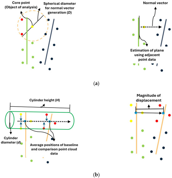 Estimation of displacement using the M3C2 algorithm. (a) Generating normal vectors for each core point. (b) Estimation of the displacement of the baseline and comparison point data using cylinders.