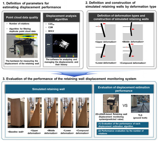 A cost-effective 2D-LiDAR-based retaining wall displacement monitoring system has recently been developed [33]. This system supports remote measurements with continuous outdoor installation, offering superior waterproofing, dustproofing, and vibration resistance, and an extended operating temperature range compared to TLSs. However, in a previous study [33], the actual deformation of the retaining wall was not considered, and the discontinuous deformation of the retaining wall was artificially created to evaluate the performance of the system, making it difficult to trust the displacement estimation performance. Additionally, because the 2D-LiDAR sensor has lower precision than the TLS commonly used in previous studies, it is necessary to analyze the impact of parameter variations on widely used displacement analysis algorithms. Therefore, this study aims to construct simulated retaining walls that resemble actual retaining wall deformations and analyze the displacement estimation performance of a 2D-LiDAR-based retaining wall displacement monitoring system according to different deformation types and key parameters related to displacement estimation algorithms and the quality of point cloud data. The findings of this study are expected to increase the reliability of the displacement estimation results of the 2D-LiDAR-based retaining wall displacement monitoring system, as they enable the determination of the appropriate parameter values for the system.
