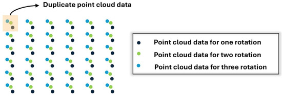 The parameters for displacement estimation were divided into two main categories. First, in Section 2.2, parameters were selected based on the quality of point cloud data in relation to rotation frequency. Second, Section 2.3 examined various displacement estimation algorithms, with the robust C2Clm, C2M, and M3C2 algorithms—chosen for their resilience to sensor errors—selected for this experiment. However, for the rotation frequency established in Section 2.2, an algorithm was required to filter out duplicate point cloud data accumulating at the same position as the rotation count increases, as illustrated in Figure 6.