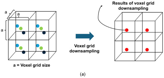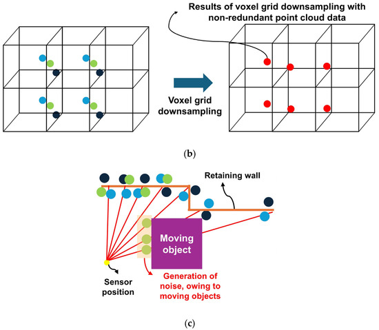The voxel grid downsampling technique is commonly used to filter duplicate point cloud data. It extends the pixels in two-dimensional image data into a three-dimensional (x, y, z) space by setting a voxel size and determining the central position of the point cloud data within each voxel. This method reduces the number of point cloud data by downsampling them (Figure 7a). However, voxel grid downsampling has the drawback of not being able to determine the positions of points that are collected redundantly (Figure 7b). This results in the formation of a voxel grid with non-redundant data. In addition, determining the appropriate voxel size is challenging, owing to variations in voxel size depending on the distance between the LiDAR sensor and the obstructing wall. Hence, it is difficult to remove noise data when moving objects occur and are treated as different voxels (Figure 7c).