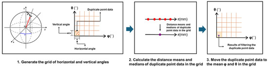 The aforementioned voxel grid downsampling technique suffers from the issue of not being able to set the initial voxel position, owing to the Cartesian coordinate system (x, y, z) that is used to define the voxel size. Thus, an algorithm has been developed to filter duplicate point cloud data by converting them from Cartesian coordinates (x, y, z) to spherical coordinates (r, φ, θ), as shown in Figure 8.