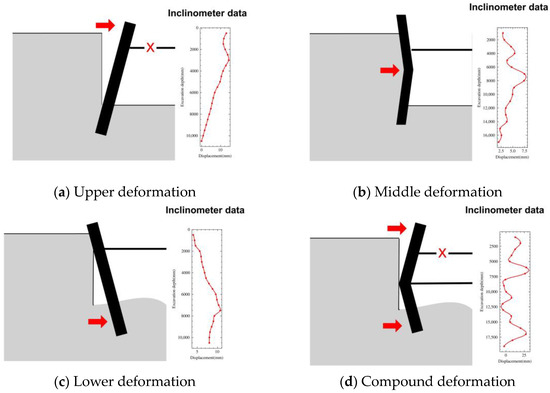 A simulated retaining wall was constructed to evaluate the displacement estimation performance of the 2D-LiDAR-based retaining wall displacement monitoring system, based on the collapse type of the retaining wall. The collapse of a retaining wall can occur in three manners [44,45]. The first occurs when the supporting structure is destroyed. This results in the maximum displacement of the retaining wall occurring at the location of the support (upper, middle, or lower). The second occurs when the excavation foundation is weak or the backfill material is insufficient, which causes either the lower part of the retaining wall to move or the entire retaining wall to be within the active zone. This results in maximum displacement and collapse at the lower part of the retaining wall. The third occurs when a bending moment generated in the retaining wall exceeds the capacity of its components. This results in maximum displacement and collapse in the middle part of the retaining wall. For the simulated retaining wall, the deformation types are defined as upper deformation, middle deformation, lower deformation, and a compound type in which upper, middle, and lower deformations occur simultaneously, considering the aforementioned collapse types (Figure 9). The displacement data of retaining walls for the four defined types of deformation were obtained from field data collected using inclinometers in previous studies [46,47,48,49].