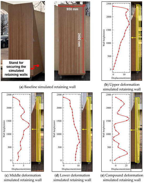 First, a baseline simulated retaining wall with no deformation was fabricated using a wood computer numerical control. The retaining wall was 950 mm wide, 2400 mm high, and 50 mm thick, as shown in Figure 10a. The baseline simulated retaining wall is secured to a fixed stand at the back. In addition, retaining walls of different types (upper, middle, lower, and compound) were simulated based on the data defined in Figure 9, using the same dimensions as those of the baseline simulated retaining wall (Figure 10). Here, the height of the simulated retaining wall and the data height of the inclinometer were different. Therefore, while maintaining the displacement data of the inclinometer, the spacing between the displacement data was reduced to match the height of the simulated retaining wall. In addition, the design ensured that the same displacement would occur in the horizontal direction of the simulated retaining wall. The deformation simulated retaining walls were also secured to the same stand as the baseline simulated retaining wall.