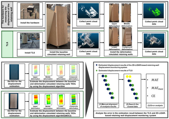 - Error analysis: The error was analyzed between the estimated displacement results of the TLS and the estimated displacement results of the 2D-LiDAR-based retaining wall displacement monitoring system.