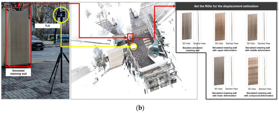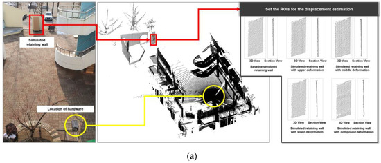Results of the point cloud data collection by the 2D-LiDAR-based retaining wall displacement monitoring system and the TLS. (a) Results of point cloud data collection and ROIs for displacement estimation by the 2D-LiDAR-based retaining wall displacement monitoring system. (b) Results of point cloud data collection and ROIs for displacement estimation by TLS.