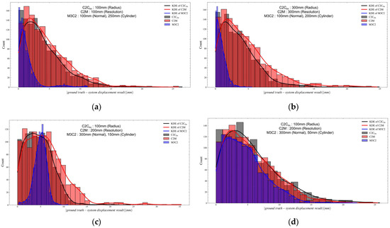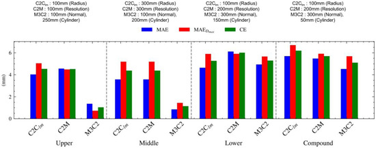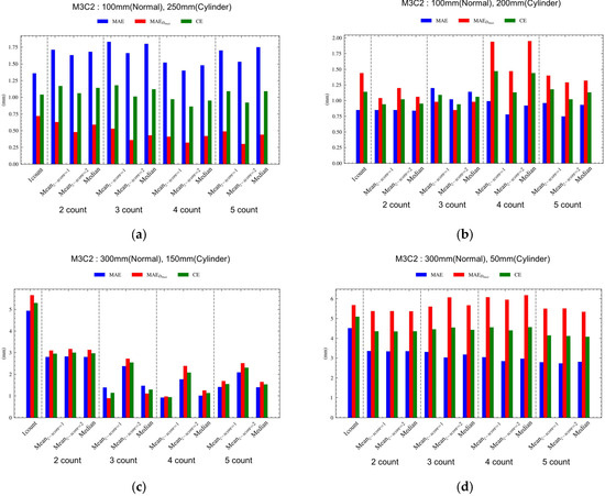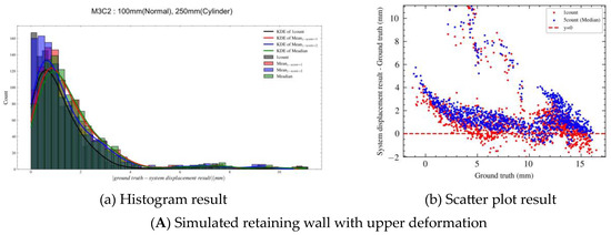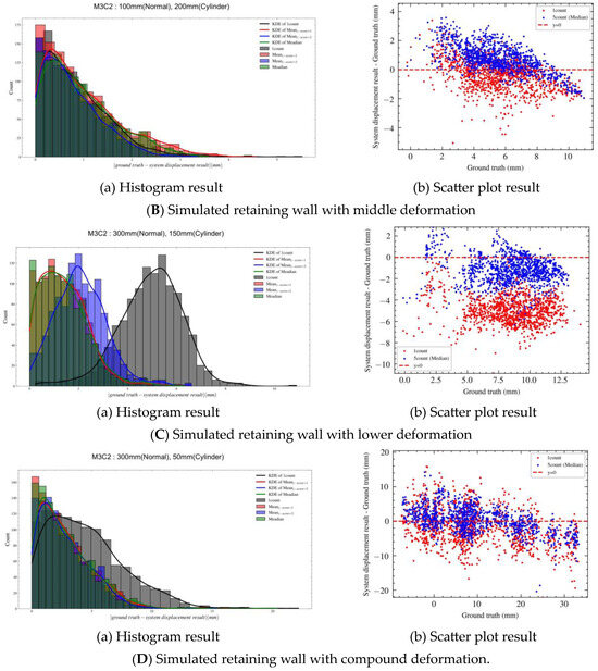 The performance evaluation of the C2Clm, C2M, and M3C2 algorithms was conducted by fixing the rotation count and speed at 1 count and 2°/s, respectively. The displacement analysis was performed using CloudCompare software (version 2.13.1). The overall performance evaluation results are presented in Appendix A. The parameter with the lowest CE for each displacement estimation algorithm was selected as the representative parameter for that algorithm (Figure 13). Descriptive statistics for each displacement estimation algorithm are presented in Table 7 below. The histograms for each displacement estimation algorithm are shown in Figure 14, and the width of the bins in the histograms was determined by the Freedman–Diaconis rule. In addition, kernel density estimation (KDE) was applied to compare the displacement estimation algorithms. Excluding the simulated retaining wall with lower deformations, the MAE (blue bar graph in Figure 13) of the M3C2 analysis algorithm was the lowest for the simulated retaining wall with upper deformation at 1.4 mm, middle deformation at 0.8 mm, and compound deformation at 4.5 mm. However, in the case of the simulated retaining wall with lower deformation, the MAE of the C2Clm algorithm was the lowest at 4.6 mm. However, upon examining the results of the M3C2 analysis (MAE: 4.9 mm), it was determined that an offset of approximately 5 mm occurred owing to external factors, as indicated by the blue line graph (KDE of M3C2) in Figure 14c. Moreover, the simulated retaining wall with compound deformation, which exhibited a significant change in the displacement rate according to the height of the retaining wall, had a high MAE of 4.5 mm compared with those of the other deformation types, as shown in Figure 13. This is because the rate of change of the displacement was high, which resulted in a lower cylinder diameter parameter in the M3C2 algorithm, compared with the other deformation types, thereby leading to a decrease in the number of surrounding data used. Based on the evaluation results of the displacement estimation performance for the simulated retaining wall with lower compound deformation, it is not possible to guarantee displacement estimation performance with a single scan. Therefore, it is necessary to increase the number of rotations to eliminate the sensor noise and improve the precision of the point cloud data. The (red bar graph in Figure 13) had the lowest values for the simulated retaining wall with upper deformation at 0.7 mm, middle deformation at 1.4 mm, lower deformation at 5.7 mm, and compound deformation at 5.7 mm. Overall, excluding the simulated retaining wall with lower deformation, the M3C2 algorithm, which showed the lowest CE (green bar graph in Figure 13) values, had the best performance compared with other displacement estimation algorithms. According to the analysis of the displacement estimation algorithms in Section 2.3, the C2Clm and C2M algorithms demonstrated similar performance levels (Figure 14). The M3C2 algorithm, however, exhibited lower variability in the displacement analysis results because it uses averaged data for the comparison point cloud data. As a result, except for the simulated retaining wall with lower deformation, the M3C2 algorithm produced results that closely matched the ground truth (Figure 14).