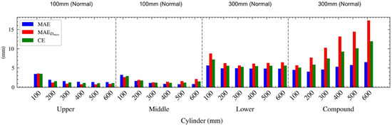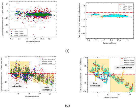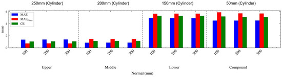 To minimize the utilization of the surrounding data, the normal vector and cylinder diameter were restricted to 10 mm. The error in estimating the displacement of the TLS and the 2D-LiDAR-based retaining wall displacement monitoring system was analyzed by manually aligning the displacement estimation results of the TLS with the displacement estimation results of the 2D-LiDAR-based retaining wall displacement monitoring system. The analysis was then performed by searching for the closest point to the TLS in the monitoring system’s analysis results and comparing the displacement estimation results obtained from the two points. The performance evaluation metrics used were the mean absolute error (MAE), which represents the average error in displacement estimation; , which represents the error near the maximum displacement; and compound error (CE), which evaluates the combined error between the average error and the error near the maximum displacement. The formulas for each metric are given in Equations (2) to (4):