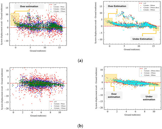 This algorithm generates a fixed grid of horizontal (φ) and vertical (θ) angles through the resolution of the LiDAR sensor and hardware rotation speed. The mean and median positions of the distance (r) data within the grid are then calculated. Next, the calculated distance value is used to transform duplicate point data into a single point, based on the mean horizontal and vertical angles within the grid. Two methods for filtering the distance (r) data within the grid are the mean-based method and median-based method. The median-based method allows for the elimination of noisy point cloud data generated by moving objects. Contrarily, the mean-based method possesses a susceptibility to noise. In this method, the mean value is calculated after applying the z-score method to eliminate noisy data points. The standard scores are calculated for each data point based on the distance from duplicate data, and any data points with standard scores exceeding a certain threshold are eliminated. The standard score is then calculated, as shown in Equation (1). The parameters for estimating the displacement performance were selected comprehensively, as summarized in Table 4.