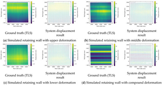 Monitoring the displacement of retaining walls is essential for maintaining their stability. Traditional displacement monitoring by inclinometer is costly and time-consuming, owing to the need for manual measurements. A recently developed 2D-LiDAR-based retaining wall displacement monitoring system offers advantages over traditional methods, such as easy installation and dismantling, as well as the cost-effective monitoring of three-dimensional displacement compared to terrestrial laser scanners (TLSs). However, a previous study did not account for the actual deformation of the retaining wall, potentially compromising the reliability of the displacement estimation. This study aims to assess the displacement estimation performance of the system by using a retaining wall that simulates real-world deformations, considering key parameters related to the displacement estimation algorithm and the quality of point cloud data. Using the multiple model-to-model cloud comparison algorithm and a developed algorithm for filtering duplicate point cloud data, the system’s average performance across various deformation types yielded mean absolute error (MAE), , and compound error values of 1.7, 2.2, and 2.0 mm, respectively. The results demonstrate that even a 2D-LiDAR, which has lower precision than a TLS, can effectively monitor retaining wall displacement through the post-processing of point cloud data.