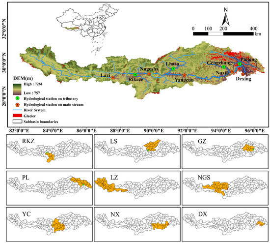 The distribution of hydrological stations in the Yarlung Zangbo River Basin and the subbasins controlled by each station.