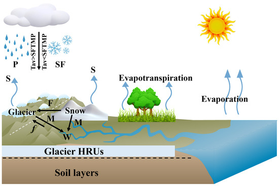 The calculation of the parameters in the glacier module is as follows. The ice melt rate (M) is an essential parameter for evaluating glacier melt runoff, and it is commonly estimated using the degree-day model. This model represents the relationship between the amount of ice and snow melt and the cumulative daily temperature. The specific calculation formula is as follows [44]: