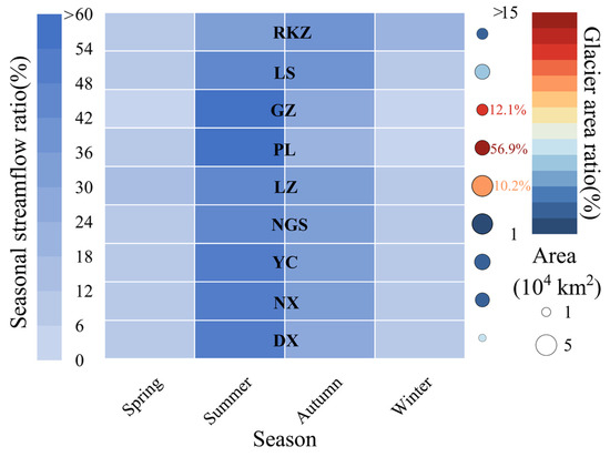 In summary, runoff at each station exhibits seasonal and monthly differences, and the underlying characteristics of the basin, including glacier distribution and meteorological factors (temperature and precipitation), also showed prominent regional characteristics. Therefore, the relationship between meteorology and runoff should be further investigated.