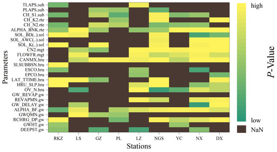 The sensitivity analysis of hydrological parameters shows that the p-value of sensitive parameters at all stations in the YZRB is less than 0.3 (Figure 5). The sensitivity ranking of parameters is determined based on their p-values, where smaller values indicate greater sensitivity. Among the nine stations, NGS and NX stations have the highest number of sensitive parameters, while PL station has the lowest number.