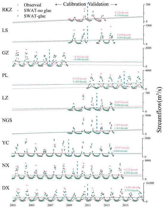 Monthly observed and simulated runoff trends from 2003 to 2016 for the nine stations in the YZRB. The slope coefficient is provided for both observed runoff (in red) and simulated runoff using the SWAT-glac model (in green). The dashed blue line separates the runoff calibration and validation time periods.