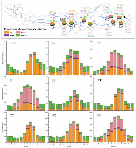 There is a noticeable difference in the contribution of the four components to runoff among the nine hydrological stations. Overall, during the study period, PRE contributes the most to runoff in the YZRB, accounting for 23.4% to 59.5% of the runoff at the nine stations, with the highest contribution at the NGS station (59.5%). SNO contributes 0.8% to 5.3% of the runoff at the nine stations, with the highest contribution at the LS station. GWQ contributes 12.4% to 40.3% of the runoff at the nine stations, with the highest contribution at the LZ station (40.3%). GLA contributes 4.5% to 54.8% of the runoff at the nine stations, with the highest contributions at the PL station (54.8%), whose glacier areas accounted for approximately 56.9% of the total glacier area in the YZRB (Figure 4). The results also show that, for the entire basin, rainfall contributes the most to runoff, accounting for 47.7%, while glacier meltwater contributes 22.8%. Particularly in the downstream (from NX to DX station), where extensive glacier distribution exists, the study indicates that glacier runoff can account for up to 36.1% of the total runoff in this region.
