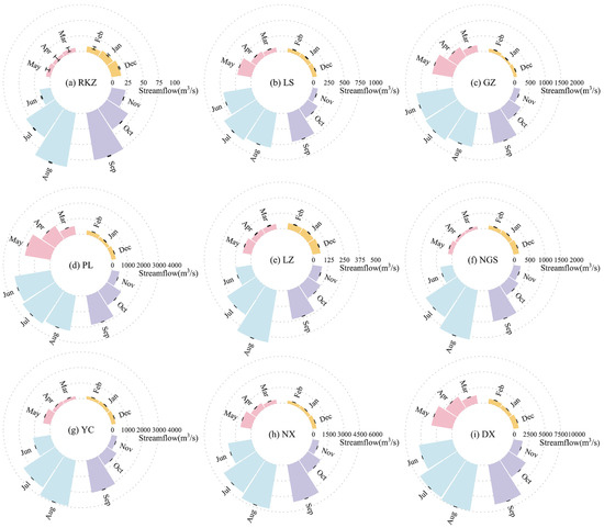 From Table S5, the summer runoff in the YZRB is highest compared with other season runoff, with the highest being 57.9% at the YC station and the lowest being 46.2% at the RKZ station. The monthly average simulated runoff values at each station also show different distributions (Figure 8). For the four stations on the tributaries, the maximum monthly average runoff occurs in August at the RKZ station, while for the other three stations, it occurs in July. The maximum monthly average runoff occurs in August for the five stations on the main stream. With the rise in temperature and the increase in precipitation, there is a sharp increase in runoff at each station in April, with the maximum proportion of the monthly average runoff to the annual total runoff in April occurring at the PL station, reaching 7.0%.