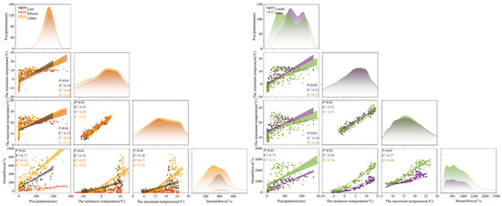 Bivariate scatterplot matrix of simulated runoff versus precipitation, maximum and minimum temperatures for the five meteorological stations. The five stations are divided into two graphs to illustrate the content conveyed by the graphs: the left graph compares the Lazi, Rikaze, and Lhasa stations, while the right graph compares the Linzhi and Bomi stations.