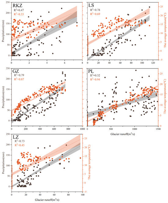 Glaciers are extremely sensitive to meteorological conditions, especially air temperature and precipitation [25,63]. Against this background, to better understand the response mechanism of runoff processes to meteorological conditions, the response of glacier runoff to rainfall and air temperature in the YZRB was analyzed (Figure 10). Overall, a positive correlation exists between glacier runoff and air temperature, indicating that air temperature substantially impacts glaciers. However, spatial heterogeneity was shown in the correlation between glacier runoff and precipitation, as well as air temperature in different regions of the YZRB. In the upstream (LZ station) and midstream (RKZ and LS stations), where runoff is mainly supplied by precipitation, the maximum R2 between glacier runoff and precipitation is observed at the LS station (R2 = 0.78, p < 0.01). In contrast, for regions where glacier meltwater is the primary source of runoff, such as the GZ and PL stations, the correlation between glacier runoff and temperature is stronger than the correlation between glacier runoff and precipitation. For the PL station, in particular, the glacier runoff is enormously significant and positively correlated with air temperature (p < 0.01) with an R2 value of 0.94, while the R2 between glacier runoff and precipitation is only 0.32. The uneven distribution of glaciers within the basin leads to significantly different responses of glacier meltwater supply in different river sections during changing meteorological conditions. Chen et al. [55], He et al. [57], and Liu et al. [2] found that the temperature in the YZRB will exhibit a significant upward trend. Under the further influence of climate change, due to glaciers’ extreme sensitivity to temperature changes [63] and the uneven distribution of glaciers, the response of runoff processes could also behave more substantial spatial heterogeneity. Therefore, for basins with glacier distribution like the YZR to further manage their water resources and ecological health, it is crucial to focus on the spatial differences in the runoff processes under climate change.