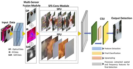 The multi-sensor fusion module integrates optical, IR, and SAR data to improve detection across varied environmental conditions. The theoretical foundation of this module lies in the multi-modal feature integration theory, which suggests that combining information from diverse sensor modalities can enhance detection accuracy by providing complementary perspectives. This module uses parallel data processing, feature extraction, and a CSU for adaptive fusion. The fusion approach leverages information redundancy to ensure robustness, especially under conditions like dense smoke or low visibility, where single-sensor models typically fail. In this section, we present the design of the AMSO-SFS model for wildfire and smoke detection using drones. The AMSO-SFS model introduces several innovative components that enhance detection capabilities in real-time drone environments. These improvements are especially useful when dealing with challenges such as low visibility, smoke occlusion, and the dynamic nature of wildfires. The core contributions of the model include multi-sensor fusion, adaptive scale and angle learning, and an innovative convolutional mechanism. This mechanism is designed for both spatial and frequency-based feature extraction. The proposed AMSO-SFS model is designed to detect both wildfire and smoke using a multi-sensor fusion approach. It integrates data from optical, IR, and SAR sensors, taking advantage of their complementary strengths for reliable detection in diverse environmental conditions.