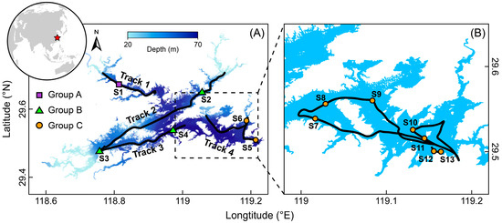 Qiandao Lake (also known as Xin’anjiang Reservoir) is the largest artificial freshwater lake in China, located at the border of the western Zhejiang province and the southern Anhui province (118°34′–119°15′E, 29°22′–29°50′N). It covers a water surface area of 580 km2 and has a storage capacity of 17.84 × 109 m3. The average water depth is 34 m, while the maximum depth reaches 108 m [1]. The lake is situated within the southeast coastal monsoon zone, which is characterized by warm climate and abundant rainfall [2,3]. The period of thermal stratification of the water body has been determined to occur between April and December each year [4,5]. As a vital water source for the Qiantang River, Qiandao Lake plays a crucial role in ensuring the ecological safety of waters in the middle and lower reaches of the river, as well as in providing a reliable drinking water supply for the Yangtze River Delta region [6,7].