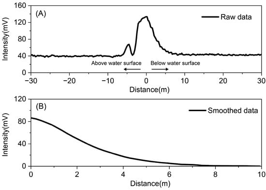 Figure 2. An example of lidar data preprocessing. (A) Raw lidar data and (B) water column signal from smoothed data. The distance 0 m is the position of the water surface, the distance below 0 m is the atmosphere altitude, and the distance above 0 m is the water depth.