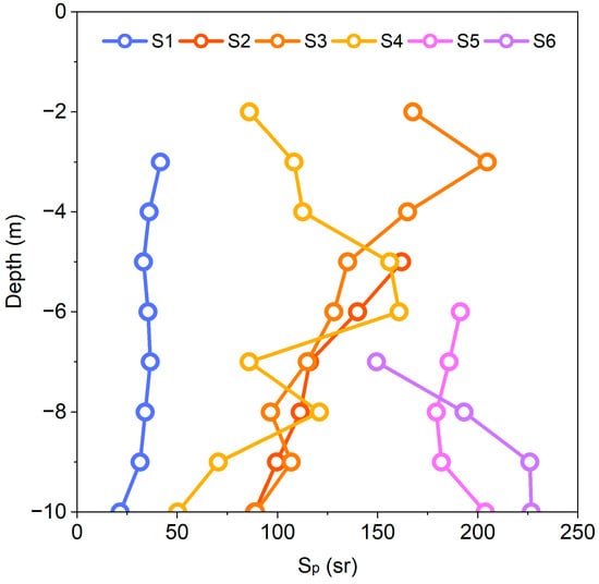 Figure 3. The depth-varying lidar ratio Sp(z) of the six measurement stations (S1–S6).